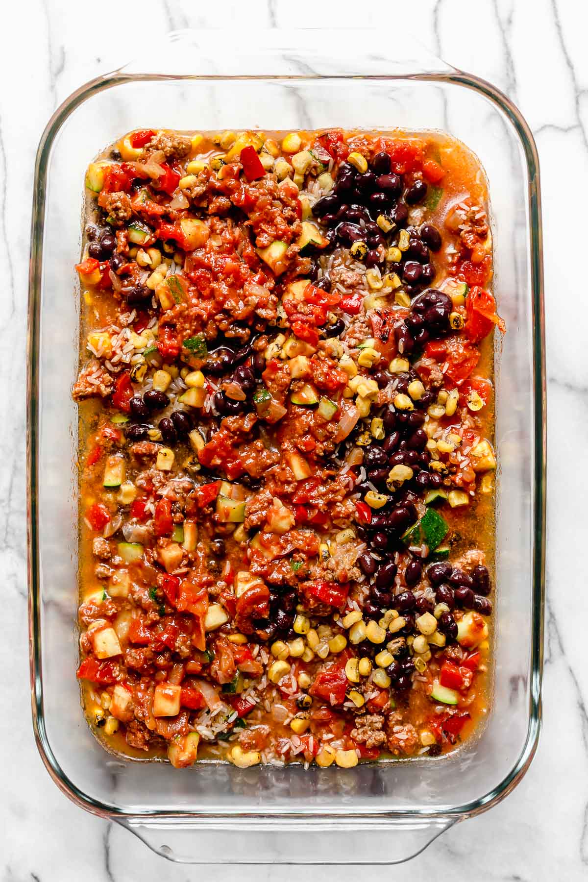 - Bake your Healthy Taco Casserole: Cover the baking dish with foil, and bake until the rice is tender. Remove the foil, sprinkle the remaining cheese on top, and pop the dish back in the oven until the cheese is golden brown and bubbly.