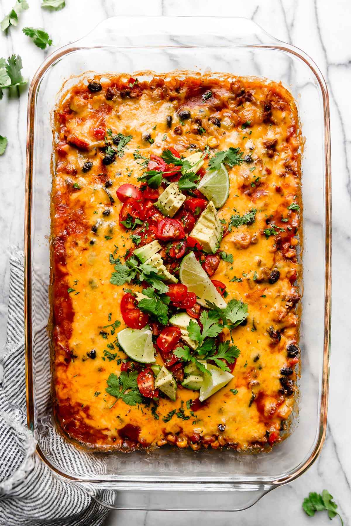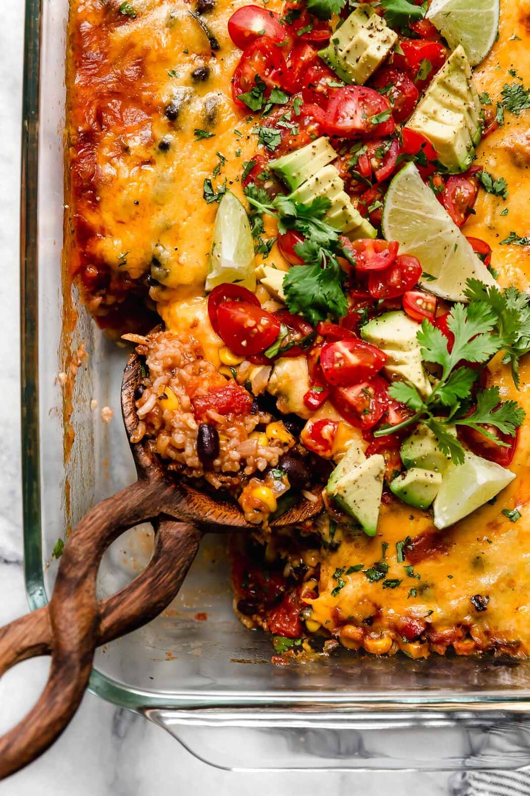 This Healthy Taco Casserole recipe calls for cheese, but to make it dairy-free, you can swap it out. Use your favorite plant-based cheese instead. Or, leave it out completely! You can always top your finished casserole off with Vegan Queso or Vegan Nacho Cheese, too.