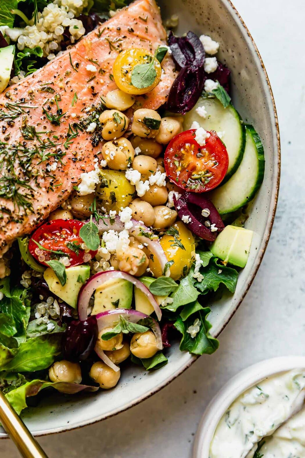 The combination of ingredients in this bowl is inspired by Mediterranean cuisine. Heart-healthy olive oil, omega-3 rich wild-caught salmon, kalamata olives, rich feta cheese, garbanzo beans, perfectly cooked quinoa (or couscous), lemon juice, cherry tomatoes, fresh dill, avocado, and homemade Tzatziki are all part of this delicious Mediterranean bowl.