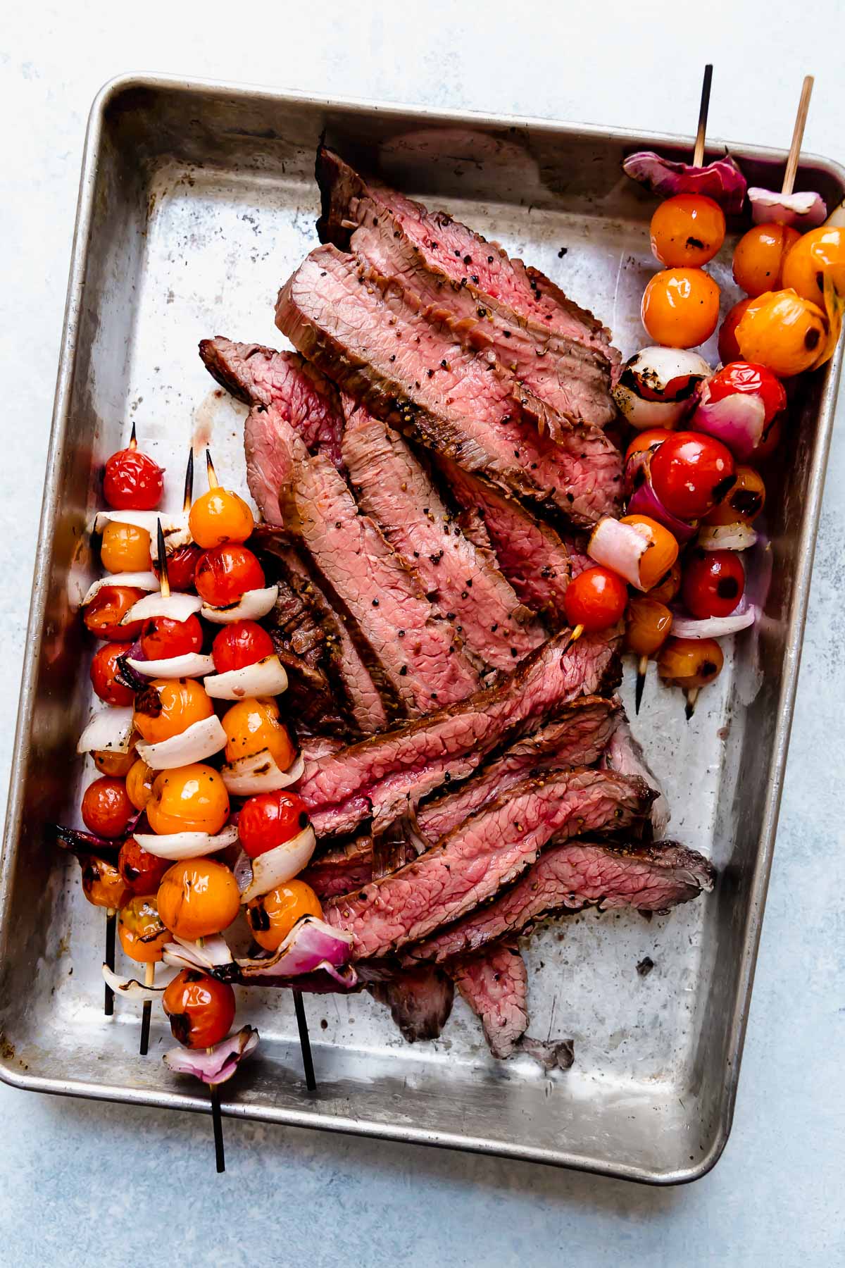 - When the grill is hot, place flank steak and tomato and onion skewers on the grill. Grill veggies, turning occasionally, for 5-8 minutes or until onions are softened and tomatoes start to blister.
