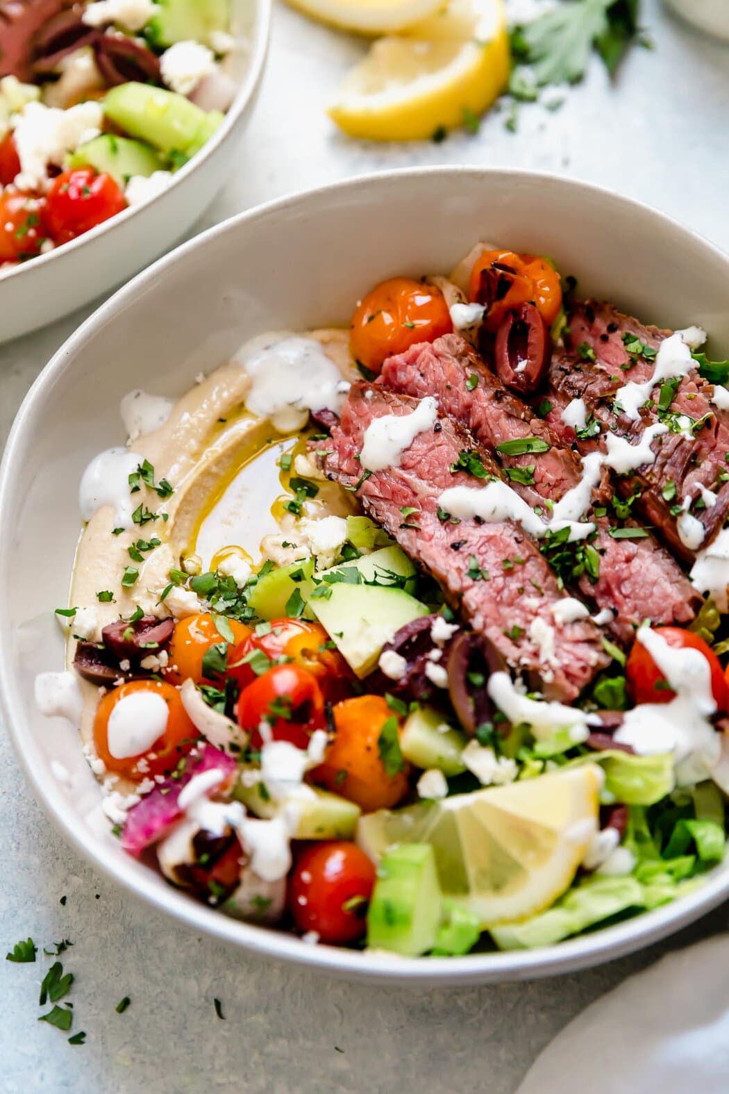 These bowls have it all! Creamy hummus, colorful vegetables, salty feta cheese and perfectly grilled flank steak.
