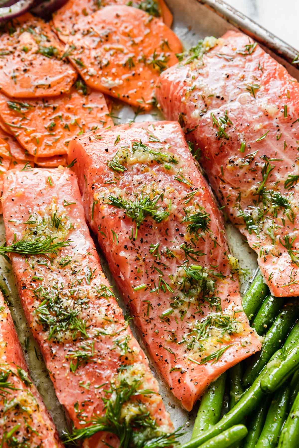 - Bake the vegetables on the sheet pan first. Add the sweet potato to the sheet pan and toss with the remaining half of the marinade; bake for 10 minutes. Then add the green beans and onion to the sheet pan (toss these with the 2 tablespoons of marinade you set aside in step 1) and pop everything back in the oven for another 5 minutes. Finally, add the salmon to the sheet pan and bake it all for 10 to 15 minutes more.