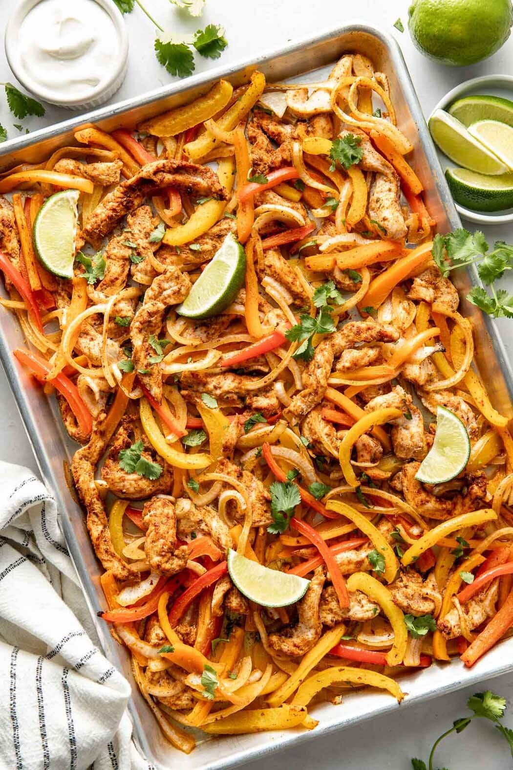 This method for making chicken fajitas on a sheet pan is genius. It’s a simple and fast way to make flavorful cooked chicken and veggies that taste great served as fajitas, fajita bowls, and fajita salads.